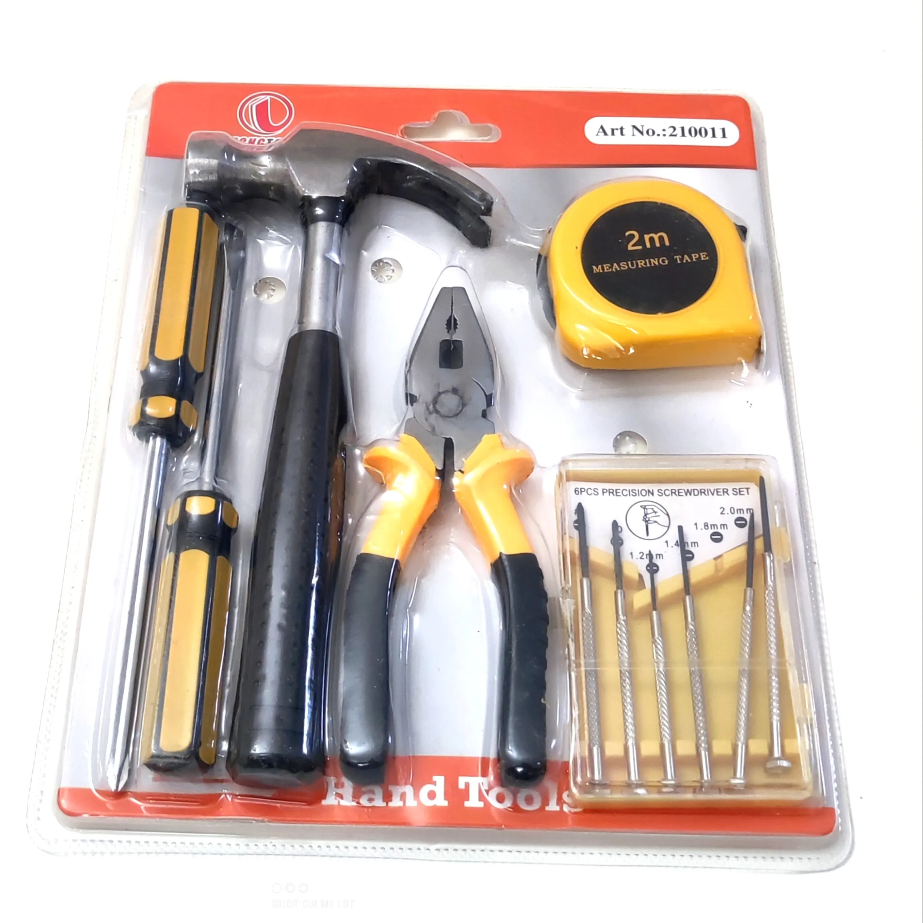 معرفیقیمت عالی ، دارای یک عدد پیچ تخت ، یک عدد تخت ، یک عدد انبر دست سایز بزرگ ،دیک عدد چکش دوشاخ ، یک بسته پیچ گوشتی شش عددی موبایلی و یک عدد متر دومتری